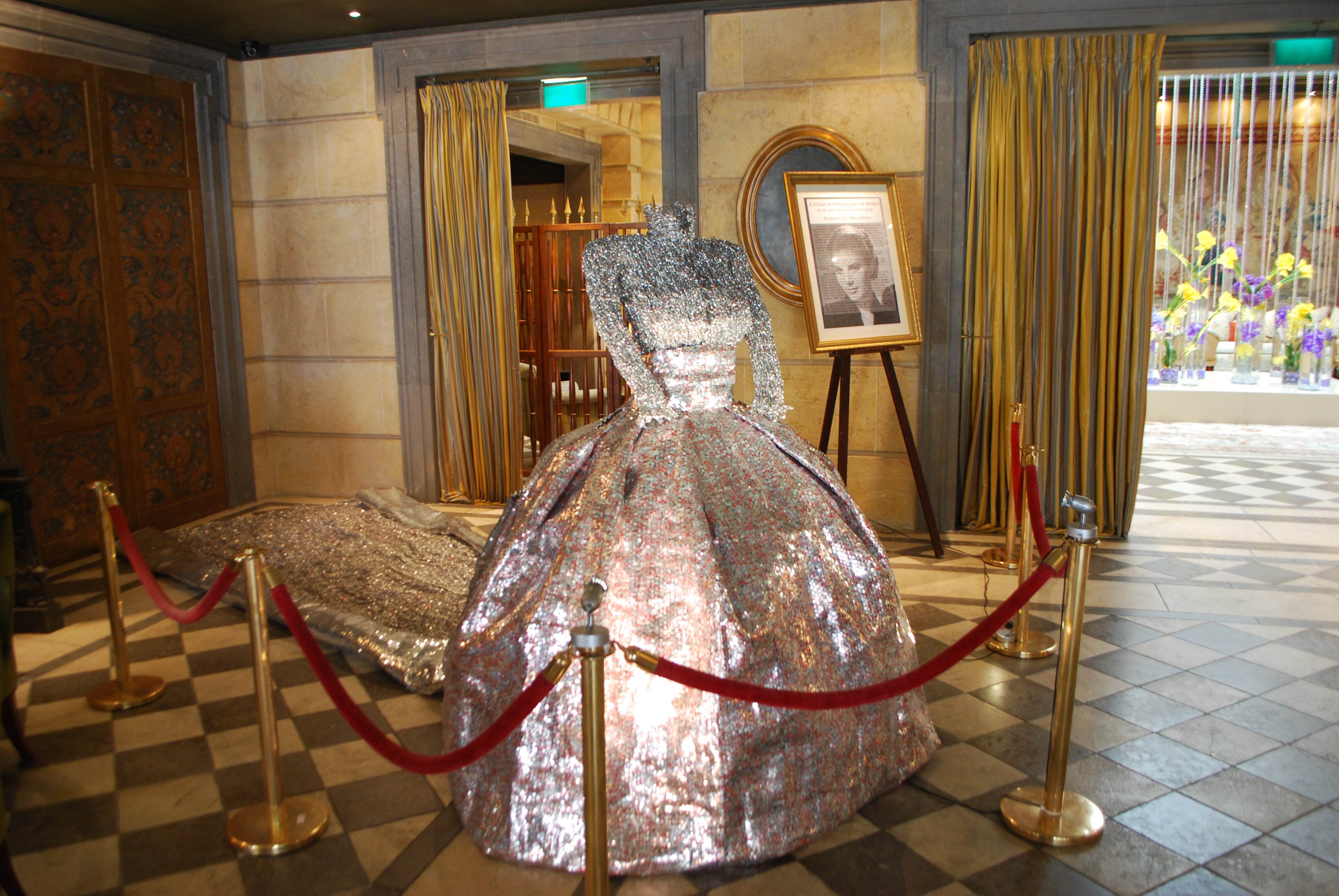 Αξίζει να σημειωθεί ότι το επιβλητικό γλυπτό, το νυφικό της Grace Kelly είχε εκτεθεί σε επίσης ατομική έκθεση του Νίκου Φλώρου στο National Museum of Women in the Arts, Washington D.C. τον περασμένο Φεβρουάριο.Το γλυπτό, διαστάσεων 1,87μ χ 1,5 μ και με την ουρά του να φτάνει τα 5 μέτρα, παρουσιάστηκε μαζί με άλλα έργα του καλλιτέχνη σε ειδικά αφιερωμένη αίθουσα του Μουσείου. Για τη δημιουργία αυτού του γλυπτού ο καλλιτέχνης χρειάστηκε 4.000 κουτάκια Coca Cola και τρία χρόνια εργασίας. Μετά από αυτό το ειδικό αφιέρωμα το μεγαλύτερο γλυπτό, το νυφικό της Πριγκίπισσας Grace θα εκτεθεί για το κοινό στο Metropole Palace στο Μόντε Κάρλο, Μονακό για παραπάνω από ένα μήνα.