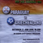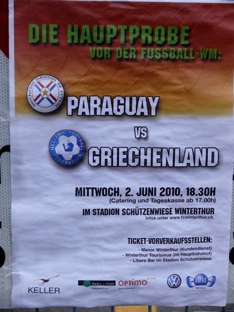 Die Gründe sind verschieden. Nach ihrem Trainingslager in Bad Ragaz (Schweiz), macht die griechische Mannschaft vor ihrem Abflug nach Südafrika, einen kurzen Wochenend-Abstecher in der Heimat. Desgleichen die paraguayanische Mannschaft. Beide sollten noch vor 21 Uhr ihren Flug erwischen. Daher wurde das Spiel auch von 19 Uhr auf 18.30 Uhr vorverlegt. Die Anfahrt von Winterthur zum Zürcher Flughafen beträgt kurze 15 Minuten. So hat Winterthur mit grossem Stolz sein allererstes A-Länderspiel beheimatet! Organisiert von Pulssport, der die griechische Mannschaft begleitet und in Winterthur seinen Hauptsitz hat – und das, wird gemunkelt, ist der wahrhaftige Grund für den Austragungsort. Networking eben!