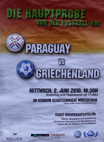 Mittwoch, 2. Juni 2010, 18.30 mitteleuropäische Zeit, Anpfiff auf der Schützenwiese Winterthur. Der Europameister 2004, Griechenland, und die drittbestplatzierte Fussballmannschaft aus Lateinamerika, Paraguay, spielen ihr letztes Freundschaftsspiel – knapp 10 Tage vor WM Start in Südafrika.