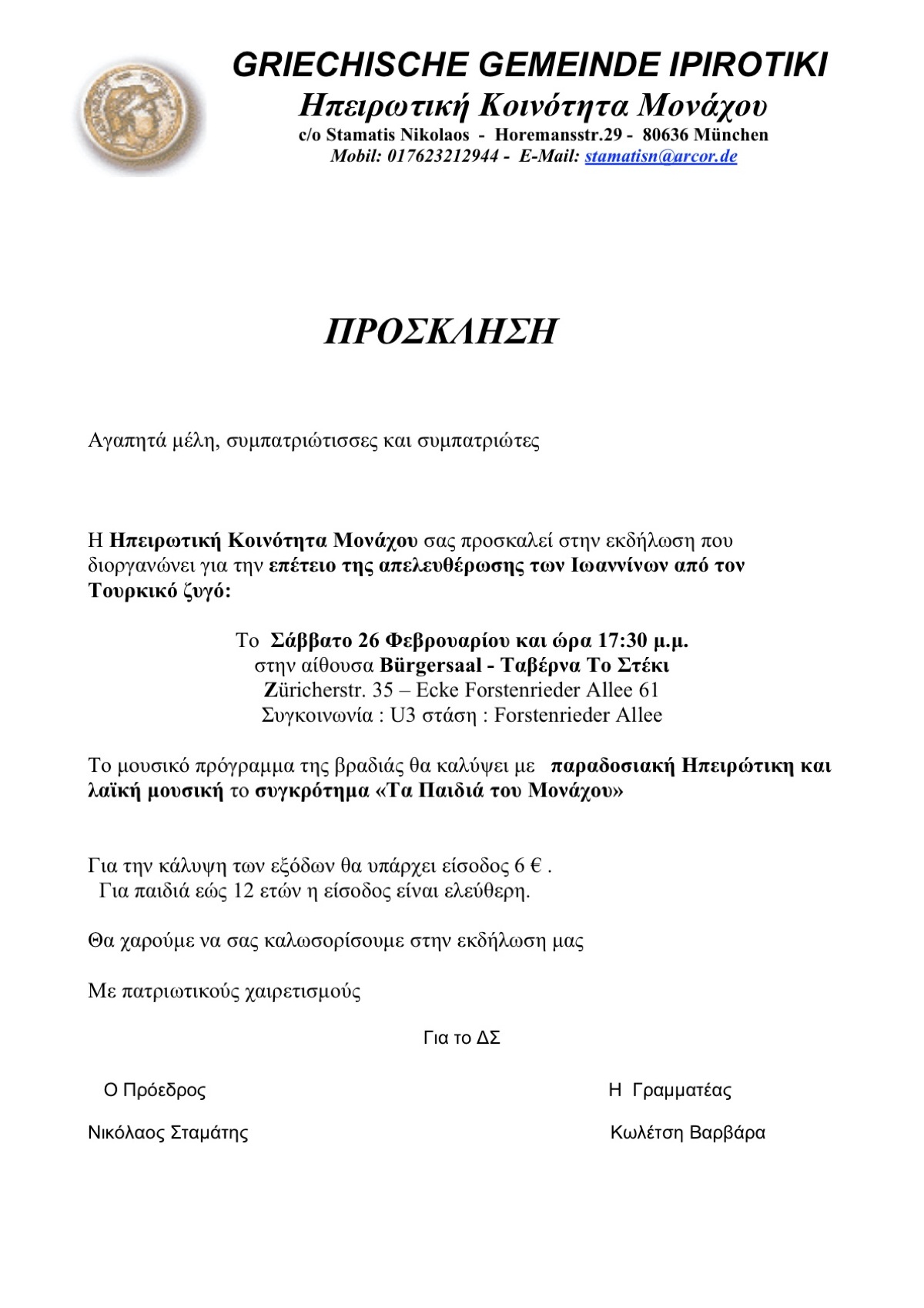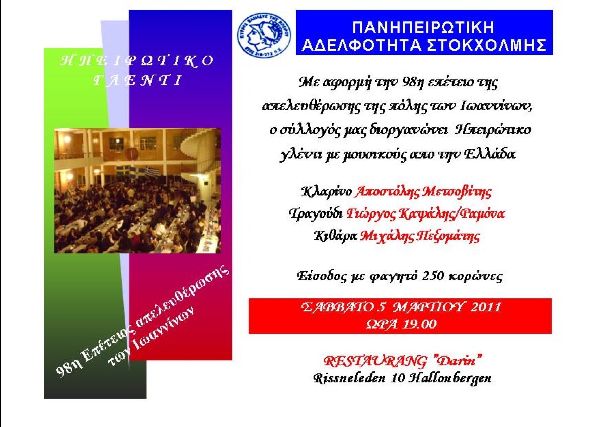 Πολυάριθμες εκδηλώσεις για την επέτειο της Απελευθέρωσης των Ιωαννίνων έχουν προγραμματίσει διάφοροι Σύλλογοι Ηπειρωτών στην Ευρώπη.