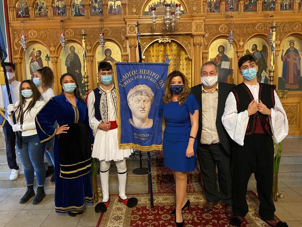 Στο μέσο της φωτογραφίας κάτω απεικονίζεται η κυρία Γενική Πρόξενος ντυμένη (στο χρώμα της Ελλάδας) δίπλα της ο Πρόεδρος του Ηπειρώτικου Συλλόγου “Δωδώνη“ κ. Κάσιας και νεαρά μέλη του Συλλόγου τους.