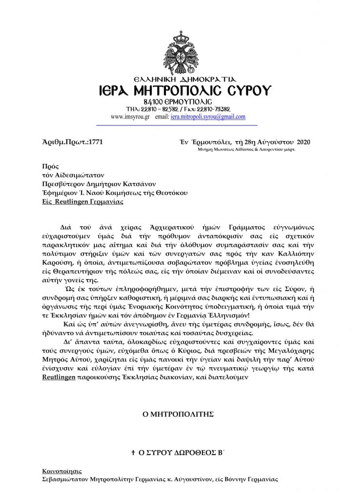 Ευχαριστήριο γράμμα απέστειλε ο Σεβασμιώτατος Μητροπολίτης Σύρου Δωρόθεος Β’ προς τον Πρεσβύτερο Δημήτριο Κατσάνο Εφημέριο του Ιερού Ναού.
