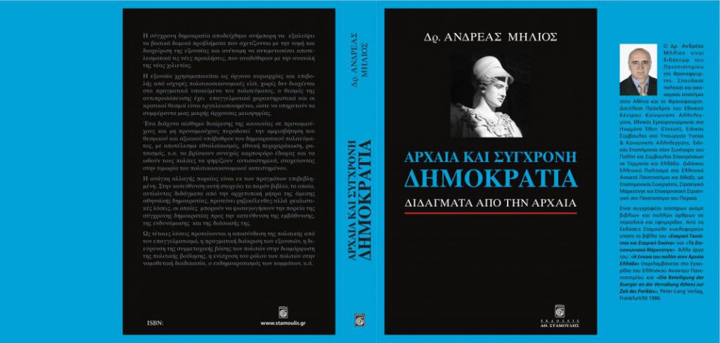 Κυκλοφόρησε το τελευταίο βιβλίο του Ανδρέα Χ. Μήλιου, «Αρχαία και σύγχρονη δημοκρατία-διδάγματα από την αρχαία», εκδόσεις ΣΤΑΜΟΥΛΗ. Πρόκειται για βιβλίο γενικού ενδιαφέροντος που κάνει σκληρή κριτική στη σύγχρονη δημοκρατία και προτείνει λύσεις για βελτίωσή της, πολλές από τις οποίες αντλούνται από την Αθηναϊκή δημοκρατία. Ο Ανδρέας Χ. Μήλιος είναι διδάκτωρ Πολιτειολογίας του Πανεπιστημίου της Φρανκφούρτης και οικονομολόγος με μεταπτυχιακό στο Μάρκετινγκ.