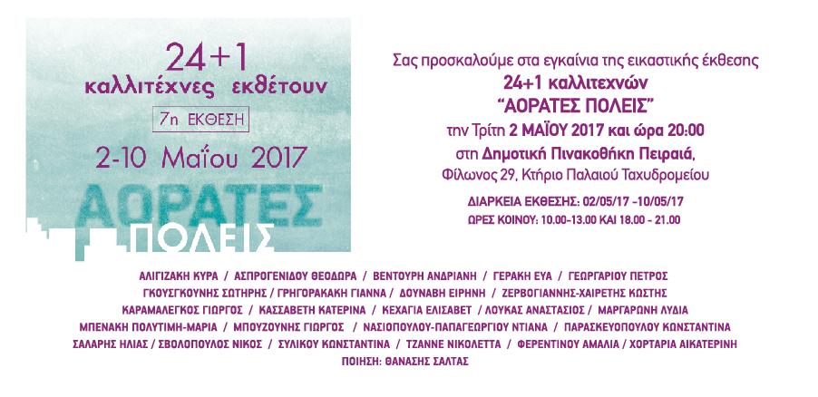 «Αόρατες Πόλεις», τίτλος εμπνευσμένος από το γνωστό βιβλίο του Ιταλού συγγραφέα Ίταλο Καλβίνο, ο τίτλος της έκθεσης 24 εικαστικών + 1 ποιητή που φιλοξενείται στη Δημοτική Πινακοθήκη Πειραιά, και εγκαινιάζεται την Τρίτη 2 Μαΐου 2017 ώρα 20:00.