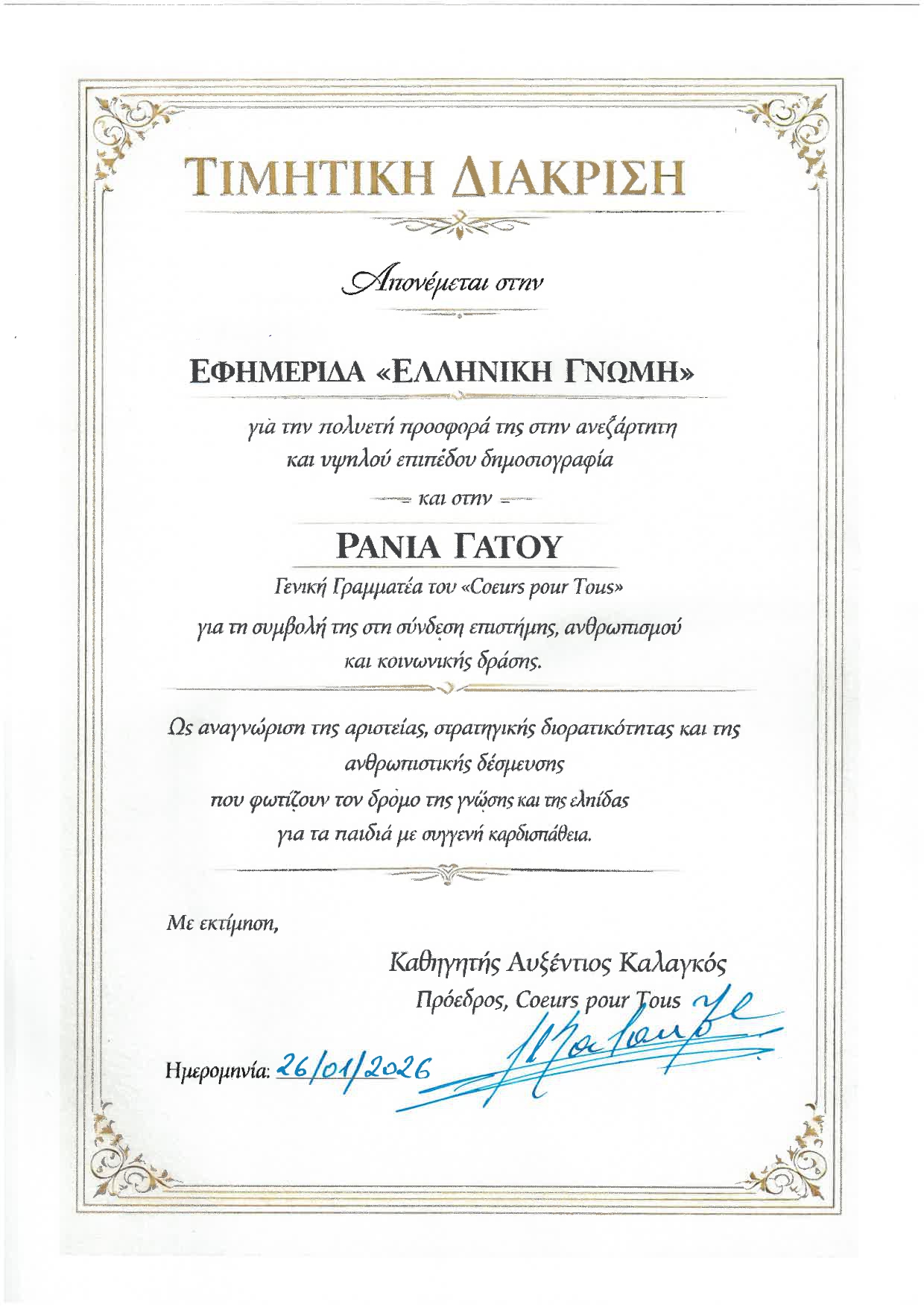 Η τέταρτη βράβευση της ΕΛΛΗΝΙΚΗΣ ΓΝΩΜΗΣ είναι γεγονός, αυτή τη φορά από ένα ίδρυμα με σημαντικό και σοβαρό φιλανθρωπικό έργο. Πρόκειται για το ίδρυμα υπό την καθοδήγηση του διεθνούς φήμης Καθηγητή Αυξέντιου Καλαγκού, το Coeurs pour Tous Hellas αφιερώνει κάθε προσπάθεια στην προστασία της ζωής παιδιών με σοβαρές καρδιοπάθειες, προσφέροντάς τους απεριόριστη πρόσβαση σε εξειδικευμένη ιατρική φροντίδα, ανεξαρτήτως κοινωνικής ή οικονομικής κατάστασης. Μέσα από χειρουργικές επεμβάσεις, εκπαίδευση ιατρών και διάχυση γνώσης, η επιστήμη μετατρέπεται σε ζωντανό εργαλείο ανθρωπισμού, όπου η τεχνογνωσία συναντά τη συμπόνια και η γνώση υπηρετεί την αξιοπρέπεια.