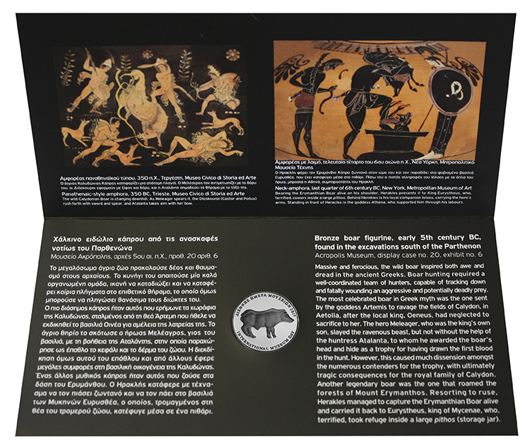 Για να τιμήσει την φετινή Διεθνή Ημέρα Μουσείων, το Μουσείο Ακρόπολης θα κυκλοφορήσει αναμνηστικό μετάλλιο που έκοψε το Εθνικό Νομισματοκοπείο με θέμα τον κάπρο. Το μεγαλόσωμο άγριο ζώο προκαλούσε δέος και θαυμασμό στους αρχαίους. Το κυνήγι του απαιτούσε μια καλά οργανωμένη ομάδα, ικανή να καταδιώξει και να καταφέρει καίρια πλήγματα στο επιθετικό θήραμα, το οποίο όμως μπορούσε να πληγώσει θανάσιμα τους διώκτες του. Η καρτολίνα με το αναμνηστικό μετάλλιο θα είναι διαθέσιμη στα Πωλητήρια του Μουσείου από την Πέμπτη 18 Μαΐου 2017.