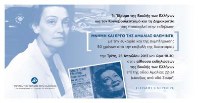 Το Ίδρυμα της Βουλής των Ελλήνων για τον Κοινοβουλευτισμό και τη Δημοκρατία, στο πλαίσιο του κύκλου εκδηλώσεων Πρόσωπα άξια τιμής και με την ευκαιρία της συμπλήρωσης 50 χρόνων από την επιβολή της δικτατορίας, διοργανώνει εκδήλωση αφιερωμένη στη μνήμη και το έργο της Αμαλίας Φλέμινγκ, στην αίθουσα εκδηλώσεων της Βουλής των Ελλήνων επί της οδού Αμαλίας 22-24 (είσοδος από την οδό Σουρή) την Τρίτη 25 Απριλίου 2017 και ώρα 18.30.