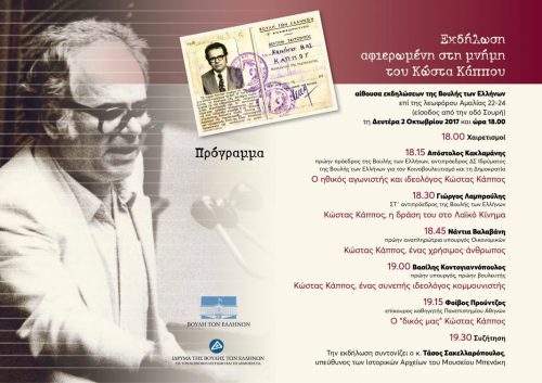 Το Ίδρυμα της Βουλής των Ελλήνων για τον Κοινοβουλευτισμό και τη Δημοκρατία και η Βιβλιοθήκη της Βουλής των Ελλήνων, με την ευκαιρία της συμπλήρωσης 12 χρόνων από τον θάνατο του Κώστα Κάππου, πρώην βουλευτή και κοινοβουλευτικού εκπροσώπου του ΚΚΕ, διοργανώνουν εκδήλωση και έκθεση με σπάνια τεκμήρια, αφιερωμένες στη μνήμη του Κώστα Κάππου, στην αίθουσα εκδηλώσεων της Βουλής των Ελλήνων επί της λεωφόρου Αμαλίας 22-24 (είσοδος από την οδό Σουρή), τη Δευτέρα 2 Οκτωβρίου 2017 και ώρα 18.00.