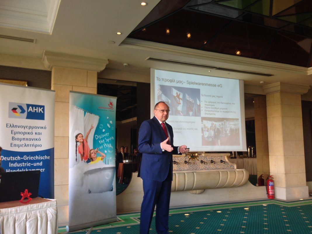 Στην εκδήλωση, σύντομους χαιρετισμούς απηύθυναν ο Γενικός Διευθυντής & Μέλος Δ.Σ. του Ελληνογερμανικού Εμπορικού και Βιομηχανικού Επιμελητηρίου, Δρ. Α. Κελέμης και η Εκπρόσωπος του Εκθεσιακού Οργανισμού Spielwarenmesse eG στην Ελλάδα και Κύπρο από το Ελληνογερμανικό Εμπορικό και Βιομηχανικό Επιμελητήριο, κα Νίκη Γκούντα, ενώ την παρουσίαση της έκθεσης πραγματοποίησε ο κ. Ernst Kick, Διευθύνων Σύμβουλος της Spielwarenmesse eG.