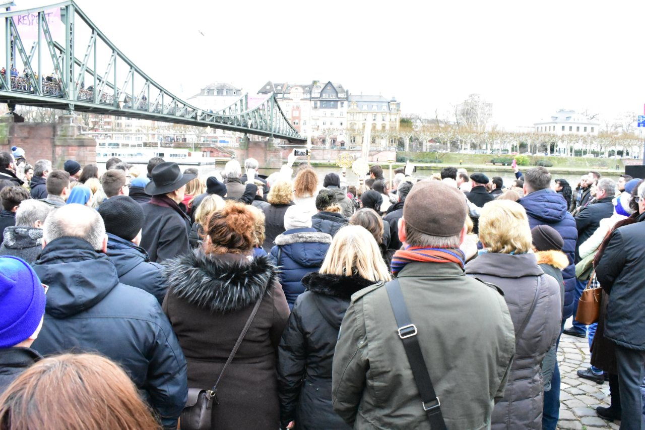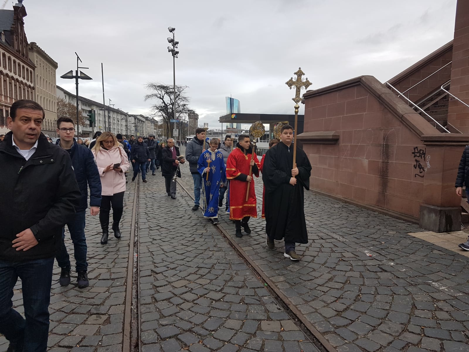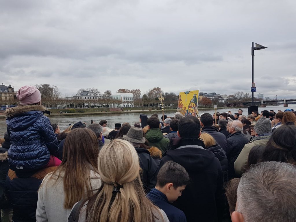 Όπως κάθε χρόνο τα τελευταία χρόνια, έτσι και φέτος, είχε τελεστεί ο Αγιασμός των υδάτων την Κυριακή στις 6 Ιανουαρίου στην πόλη της Φραγκφούρτης με την κατάδυση του Τιμίου Σταυρού στα παγωμένα νερά του ποταμού Main και τη συμμετοχή των δυο Ελληνικών Εκκλησιών του Αγίου Γεωργίου και του προφήτου Ηλία, αλλά και της Ρουμανικής Εκκλησίας. Τη δοξολογία που ξεκίνησε από το δημαρχείο της πόλης και κατέληξε στην όχθη του ποταμού και δίπλα στη γέφυρα Eiserner Steg παρακολούθησε και η Γενική πρόξενος της Ελλάδας στη Φραγκφούρτη κυρία Μαρία Ζήση. Επίσης στον χώρο παραβρέθηκε και πλήθος κόσμου και από τις τρεις Εκκλησίες.