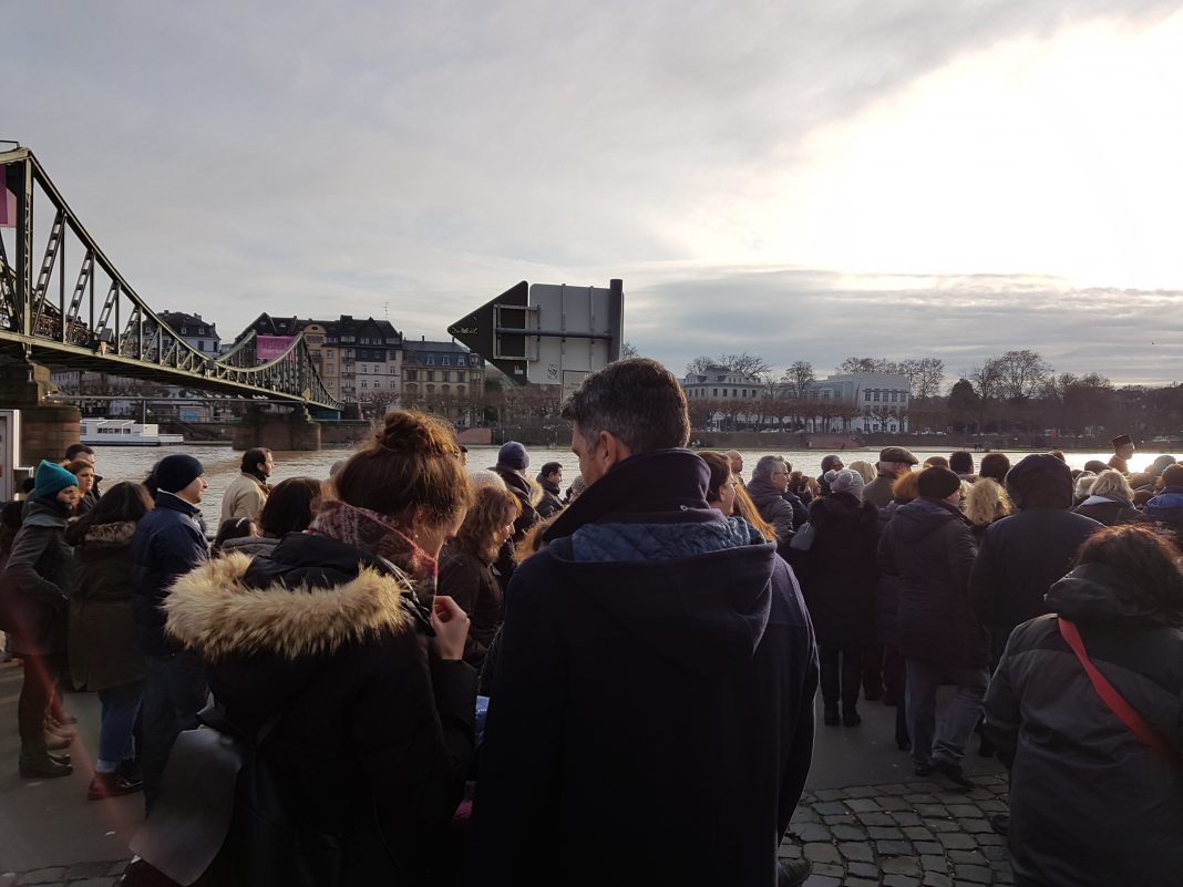 Οι πιστοί στέκονταν γύρω από την εξέδρα αλλά και αρκετοί υπήρχαν πάνω στη γέφυρα Eiserner Steg στην οποία δεσπόζει μια ελληνική επιγραφή του Ομήρου που γι’ αυτό τον λόγο την ονομάζουμε εμείς οι Έλληνες της πόλης ελληνική γέφυρα. Η ομηρική επιγραφή στήθηκε γιατί αυτή ήταν η επιθυμία του αρχιτέκτονα που την κατασκεύασε. Αν και τις προηγούμενες μέρες έβρεχε καταρρακτωδώς τη συγκεκριμένη μέρα είχε λιακάδα. Βέβαια έκανε πολύ κρύο πράγμα που όμως δεν εμπόδισε τόσο τους κληρικούς αλλά όσο και τον κόσμο να τελέσουν τον Αγιασμό των υδάτων της πόλης.