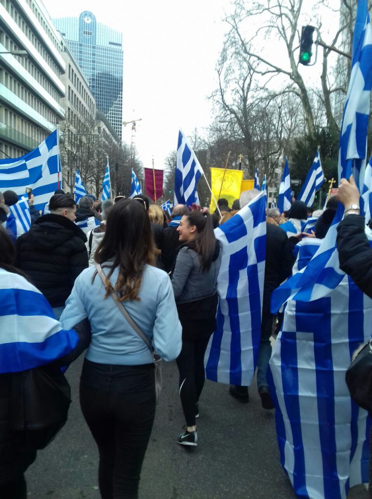 Εκατοντάδες Έλληνες της Φρανκφούρτης πραγματοποίησαν σήμερα δυναμική πορεία από την Όπερα μέχρι το ελληνικό Προξενείο, κρατώντας ελληνικές σημαίες, και φωνάζοντας συνθήματα για την ελληνικότητα της Μακεδονίας. Αλλά και για το γεγονός,  ότι  το κράτος των Σκοπίων θα μπορούσε να έχει ένα οποιοδήποτε όνομα χωρίς τη λέξη Μακεδονία. Μακεδονία σημαίνει Ελλάδα και ήταν, είναι και θα είναι μία και Ελληνική, βροντοφώναξαν οι Έλληνες της Φρανκφούρτης σε μια δυναμική πορεία.