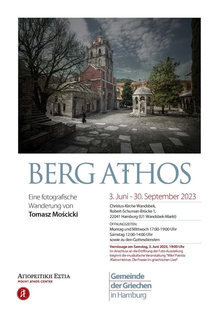 Μετα από πρόσκληση της “Κοινότητας Ελλήνων Αμβούργου” και του προέδρου της κ. Παναγιώτη Δροσινάκη, εγκαινιάζεται το Σάββατο 3 Ιουνίου στο Αμβούργο η έκθεση φωτογραφίας με τίτλο Φωτογραφικό οδοιπορικό στο Άγιον Όρος με τη ματιά του πολωνού φωτογράφου Tomasz Mosciski(Τόμας Μοστσίτσκι).
