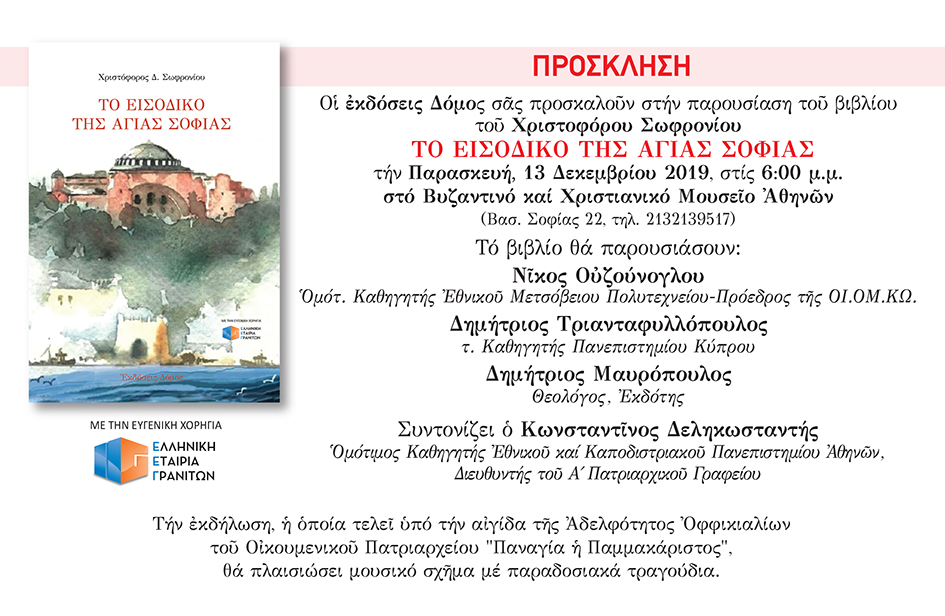 Το βιβλίο «Το Εισοδικό της Αγίας Σοφίας», του Χριστόφορου Δ. Σωφρονίου, Άρχοντος Υπομνηματογράφου της Μεγάλης του Χριστού Εκκλησίας, που κυκλοφορεί από τις εκδόσεις Δόμος, αποτελεί μια τετράχρωμη σκληρόδετη πολυτελή έκδοση 288 σελίδων, με πληθώρα εικόνων και πινάκων και πρόλογο του Οικουμενικού Πατριάρχη κ. Βαρθολομαίου.