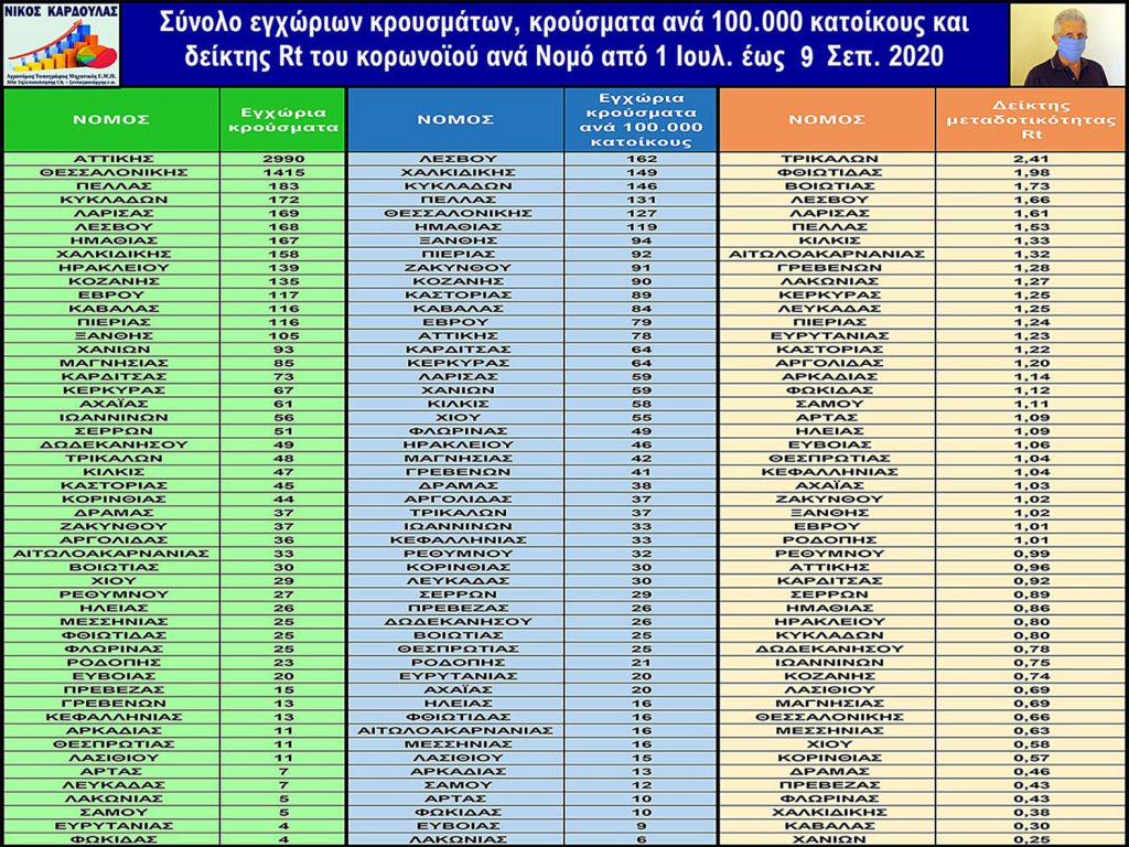 Στον παρακάτω πίνακα αποτυπώνονται σε πίνακα το σύνολο των εγχώριων κρουσμάτων, τα εγχώρια κρούσματα ανά 100.000 κατοίκους και ο δείκτης μεταδοτικότητας Rt ανά Νομό της χώρας μας, στο χρονικό διάστημα των 71 ημερών της παρούσας μελέτης.