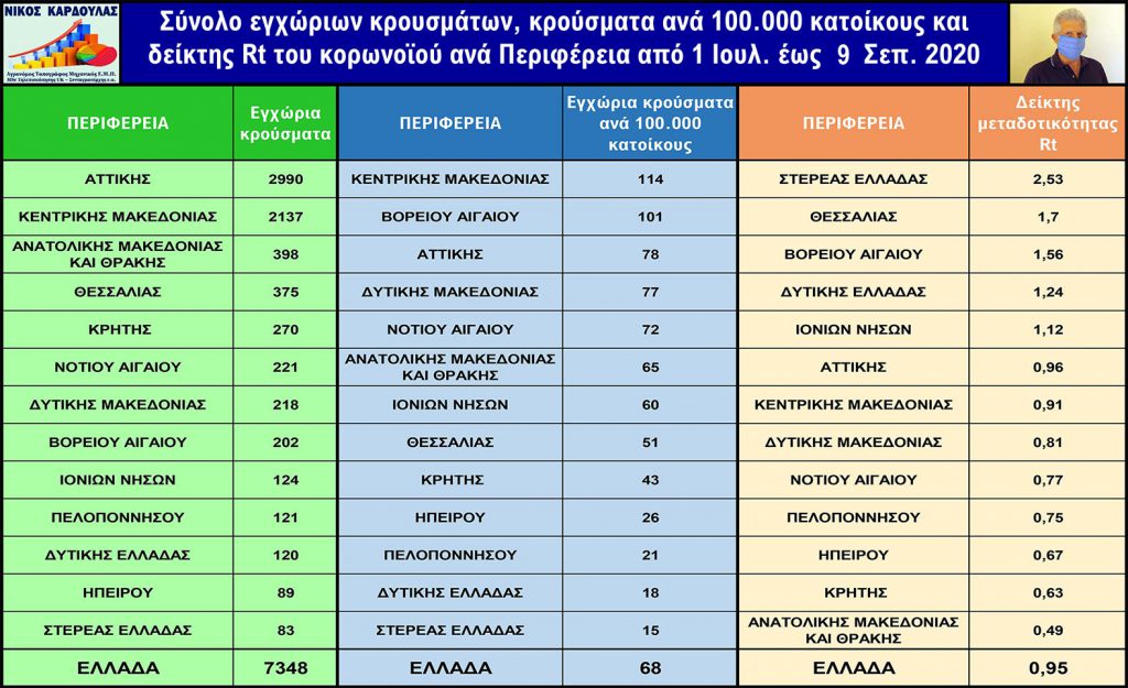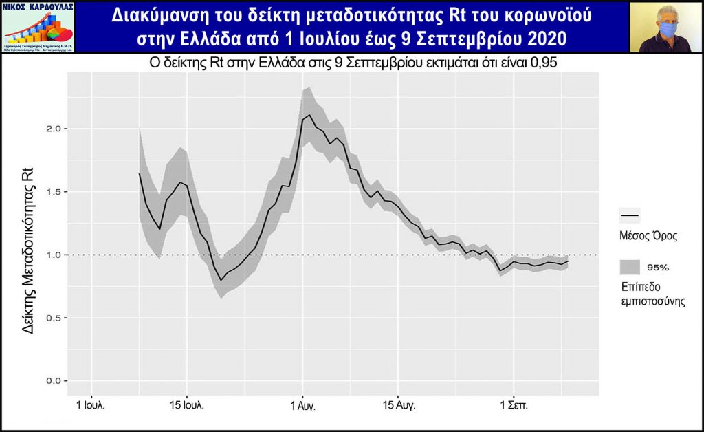Από τον παραπάνω πίνακα προκύπτει ότι ο δείκτης Rt στην Ελλάδα στις 9 Σεπτεμβρίου εκτιμάται ότι είναι 0.95, γεγονός που σημαίνει ότι η επιδημία διατηρείται, ενώ διαπιστώνεται ότι ο Rt έχει υπερβεί και την τιμή 2 σε κάποια χρονική στιγμή.