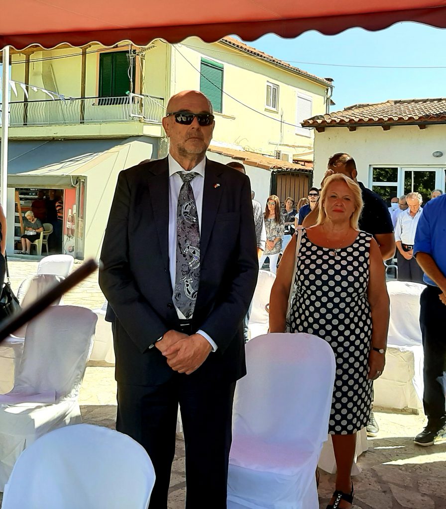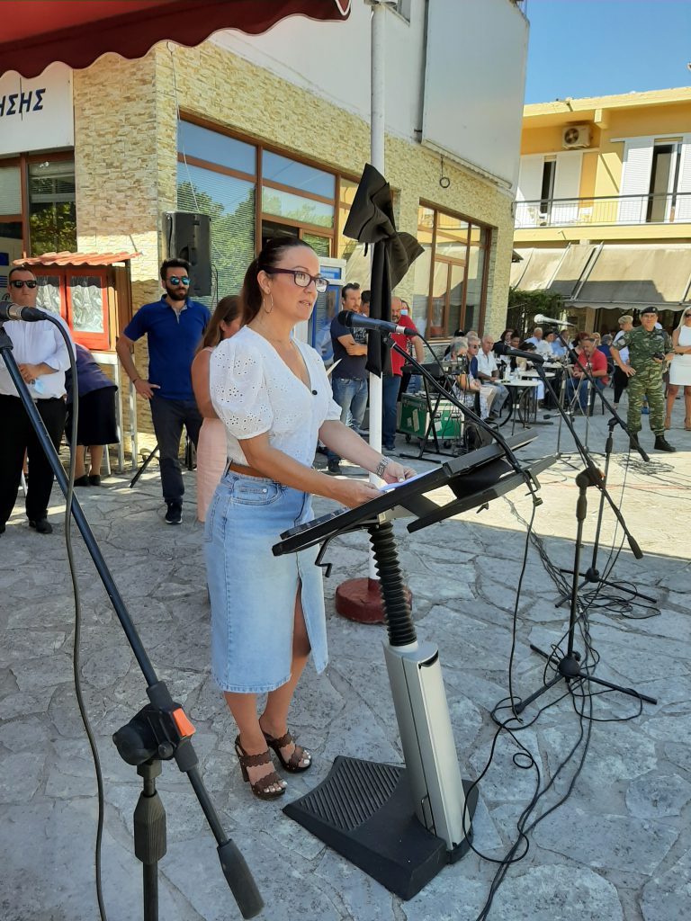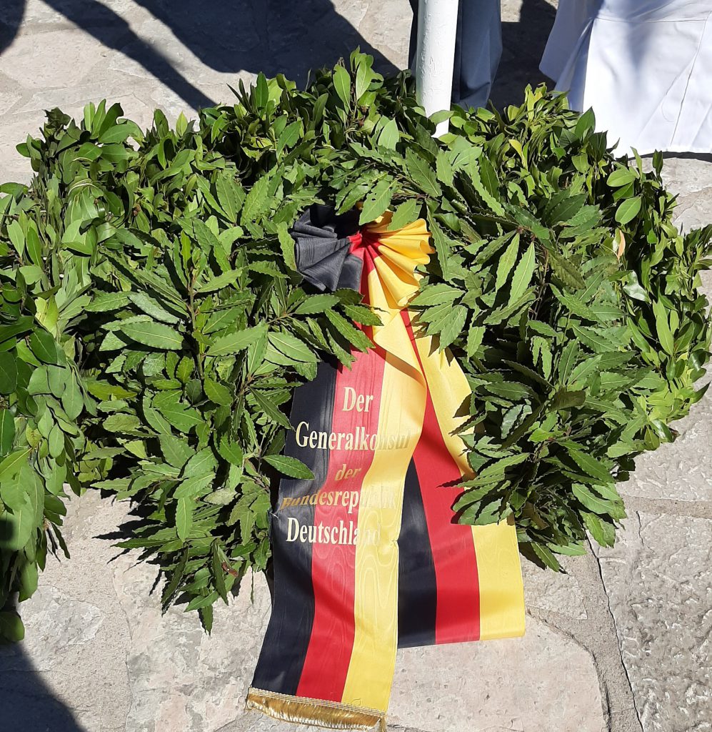 Als wir gegen 10 Uhr in Kommeno eintreffen, ist der Platz vor dem Denkmal schon gut gefüllt. Herzliche Umarmungen und Küsse werden ausgetauscht. Von Maskenträgern so gut wie keine Spur. Der Abstand zwischen den einzelnen Tischen besteht eine Weile, aber die anrückenden Gäste heben ihn schnell auf. Sie suchen die Nähe und Vorsicht vor Ansteckung mit dem Virus bleibt ein frommer Wunsch. Danach ist alles wie jedes Jahr. Nach dem Kirchgang werden wie gewohnt die 317 Namen der Ermordeten verlesen. Kränze aus vielen Gemeinden werden feierlich niedergelegt. Die Bürgermeisterin aus Nikolaos Skoufa beginnt, ihr folgen zahlreiche andere von Politikern und Bürgermeistern aus betroffenen Gemeinden, unter anderen aus Ioannina, Kalavrita und Distomo. Die deutsche Seite wird vertreten durch den stellvertretenden Generalkonsul Müller und die Honorarkonsulin Lohr.