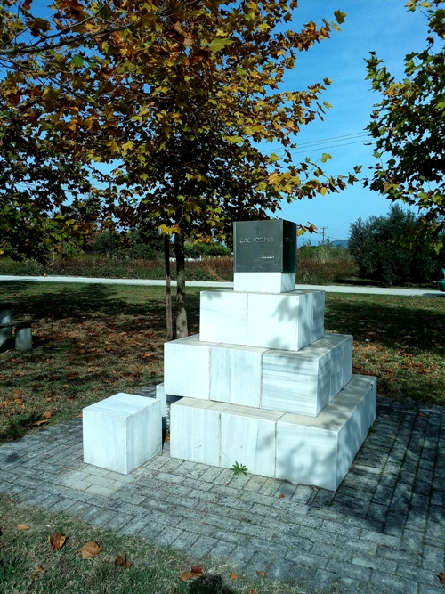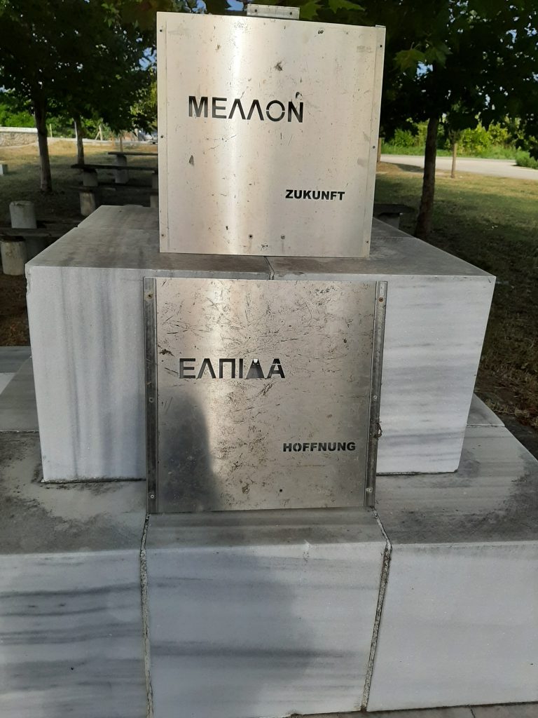 Mit gemischten Gefühlen verlassen wir Kommeno. Am Tor zum Friedhof bewundern wir noch die schönen, von den Jugendlichen des aktuellen forums 2011 gepflanzten Bäume rund um das damals errichtete Marmordenkmal. Dort lehnen an der Spitze neben den Tafeln Freiheit und Frieden nur noch lose die Tafeln für Hoffnung und Zukunft. Hoffnung und Zukunft, gerade in Pandemiezeiten unverzichtbar.