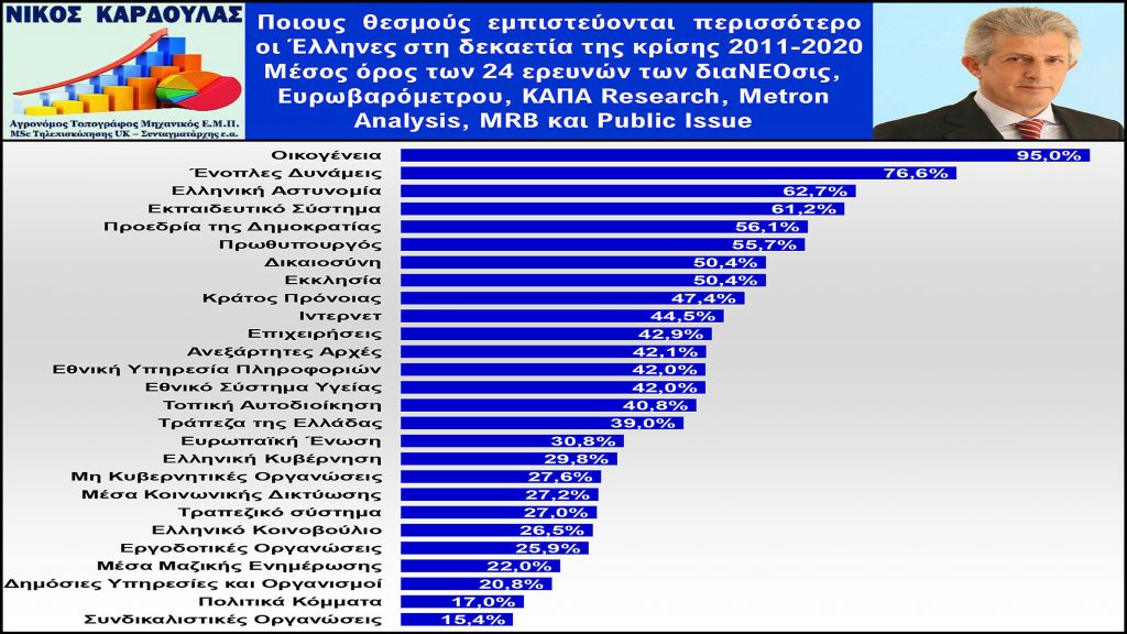 Η Οικογένεια με ποσοστό εμπιστοσύνης 95%και οι Ένοπλες Δυνάμεις με ποσοστό 76,6%είναι οι θεσμοί που εμπιστεύονται περισσότερο οι Έλληνες στην τελευταία δεκαετία της κρίσης από το 2011 μέχρι το 2020. Την πρώτη πεντάδα εμπιστοσύνης συμπληρώνουν η Ελληνική Αστυνομία με ποσοστό 62,7%, το Εκπαιδευτικό Σύστημα με ποσοστό 61,2% και η Προεδρία της Δημοκρατίας με ποσοστό 56,1%.