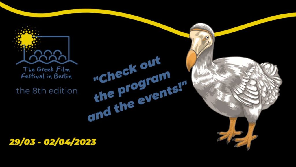Το The Greek Film Festival in Berlin θα σηκώσει αυλαία για 8η φορά στον κινηματογράφο Babylon, 29 Μαρτίου με 2 Απριλίου 2023. Το φεστιβάλ είναι έτοιμο να υποδεχτεί με ασφάλεια ξανά τους κινηματογραφιστές, τους καλεσμένους, τους σινεφίλ και τους αγαπημένους φίλους του στις σκοτεινές αίθουσες.