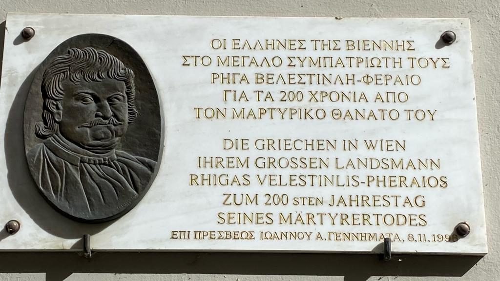 Μετά το τέλος της Θείας Λειτουργίας, η Δρ. Όλγα Σαραντοπούλου, συνοδευόμενη από μέλη της ομογένειας, κατέθεσε εκ μέρους της «Ελληνικής Εταιρείας Αυστρίας» στέφανο στην αναμνηστική πλάκα του μεγάλου συμπατριώτη Ρήγα Βελεστινλή Φεραίου.
