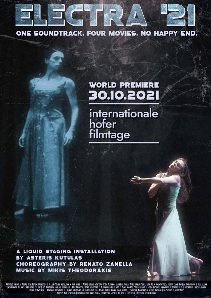 ΟΑστέρης Κούτουλας, σκηνοθέτης, συγγραφέας, παραγωγός και μόνιμος κάτοικος Βερολίνου, παρουσίασε στη φετινή διοργάνωση του Διεθνούς Κινηματογραφικού Φεστιβάλ του Hofκαι σε παγκόσμια πρεμιέρα την πολυμεσική εγκατάσταση ELECTRA ’21 με βάση τη φιλοσοφία του LiquidStaging. Έτσι εκπληρώθηκε το όραμα του κ. Κούτουλα να συνενώσει τρεις διαφορετικούς κόσμους – τον κινηματογράφο, το μπαλέτο και το ζωντανό θέαμα – σε μια ενιαία καλλιτεχνική εμπειρία κατάλληλη για το κοινό του 21ου αιώνα. Στο πλαίσιο αυτής της καινοτόμας προσέγγισης προβλήθηκαν ταυτόχρονα και με απόλυτο συγχρονισμό ήχου τέσσερις ταινίες βασισμένες στη μουσική του Μίκη Θεοδωράκη που συνέθεσε για την όπερα «Ηλέκτρα». Η χορογραφία που περιέχουν τρεις από τις τέσσερις ταινίες είναι του RenatoZanella.