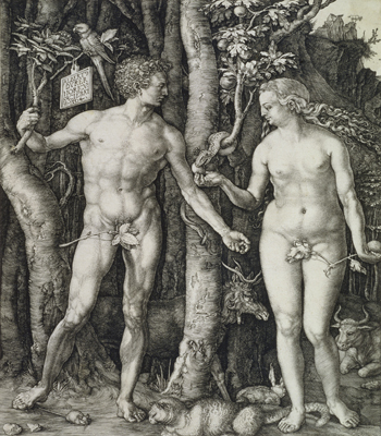 Το έργο του Ντύρερ θα λέγαμε ότι κινείται βασικά γύρω από δύο άξονες: τον θρησκευτικό και τον κοσμικό. Με βάση αυτό τον πολύ γενικό διαχωρισμό, θαυμάζουμε από τη μια πολλές σειρές έργων θρησκευτικού περιεχομένου και εκκλησιαστικής θεματολογίας και από την άλλη κυρίως πορτρέτα, τα οποία δημιούργησε ο καλλιτέχνης κατόπιν παραγγελίας. Να ήταν άραγε η έντονη θρησκευτικότητα που διακατείχε τον ίδιο και η απόπειρα προσέγγισης του θείου μέσα από την τέχνη του που έφτιαξε αυτά τα αριστουργήματα ή απλώς μια τάση της εποχής του; Έργα πάντως όπως ο «Αδάμ και Εύα» αποτυπώνουν σε μέγιστο βαθμό την επίδραση της αναγεννησιακής τέχνης στις τέλειες αναλογίες του ανθρώπινου σώματος. Καθώς στεκόμαστε μπροστά στη διπλή ελαιογραφία των πρωτοπλάστων, σε φυσικό μέγεθος, η ματιά μας αιχμαλωτίζεται από ένα υπερφυσικό φως, το φως της προπτωτικής αγνότητας που εκπέμπουν τα αλαβάστρινα σώματα, και μένουμε κυριολεκτικά έκθαμβοι από το κάλλος και την καθάρια έκφραση των προσώπων τους. Τα πορτρέτα του, πάλι, με το διαυγές βλέμμα και την αθώα έκφραση, μιλούν από μόνα τους για τη σημασία που ο Ντύρερ έδινε σ’ αυτή την πλούσια κατηγορία έργων κατά τη διάρκεια όλης της καριέρας του πίνακες που αντανακλούν την καθαρότητα της ψυχής των εικονιζομένων.