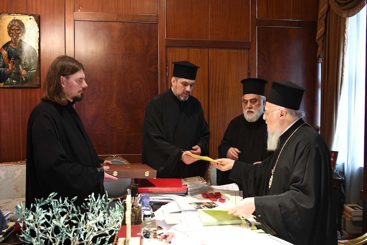 Ένα ικανόαπότμημα του Ιερού Λειψάνου της Αγίας Αναστασίας της Φαρμακολυτρίας προσέφεραν στον Οικουμενικό Πατριάρχη Βαρθολομαίοοι κληρικοί π.ΜπογκτάνΓουλιάμωφ και π.ΠέτροςΖούγιεφ, της Αυτοκεφάλου Εκκλησίας της Ουκρανίας, κατά την συνάντησή που είχανσήμερα, Τετάρτη, 10 Απριλίου, στο Φανάρι.