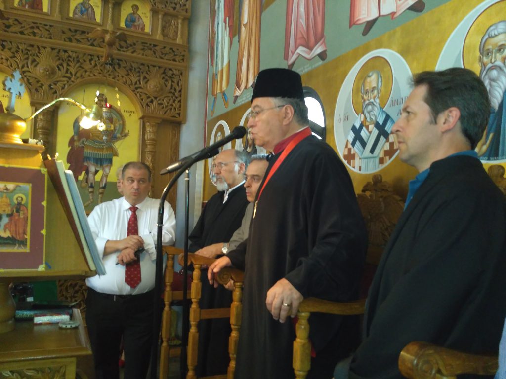 Στον εσπερινό του Σαββάτου χοροστάτησε ο Θεοφιλέστατος Επίσκοπος Αρίστης κ. Βασίλειος και έψαλλε με βυζαντινή μεγαλοπρέπεια ο καλλιφωνότατος Μουσικοδιδάσκαλος, Άρχων Υμνωδός της Αγίας του Χριστού Μεγάλης Εκκλησίας κ Αντώνιος Πατρώνας. Στο κήρυγμά του ο Θεοφ. Επίσκοπος αναφέρθηκε στο γεγονός της Εκκλησίας, μάλιστα δε υπογράμμισε την παρουσία, την ενέργεια και τη δύναμη του Αγίου Πνεύματος, που αποτελεί και είναι, ο νους και η καρδιά της Εκκλησίας. Αυτό είναι που επιτελεί το ενοποιό, σωστικό και λυτρωτικό έργο του, κτίζοντας μέσα μας και γύρω μας τον καινούργιο κόσμο, τον οποίο καινούργιο κόσμο εγκαινιάζει ο Θεάνθρωπος Σωτήρας μας με την Ανάστασή του. Σ΄αυτή την πορεία, σ΄ένα τέτοιο έργο της Εκκλησίας μας διακονούμε όλοι μας, ποιμένες και ποιμενόμενοι, ο καθένας μας από τη θέση του και με τα δωρήματα και χαρίσματά του, λαικοί και κληρικοί, έχοντες πρότυπα και δείγματα τους Αγίους Πάντες, μάλιστα δε την ομολογία τους, τη μαρτυρία τους – μαρτυρία Ιησού Χριστού- έχοντες και μιμούμενοι το φρόνημά τους το ορθόδοξο και το βίωμά τους το εκκλησιαστικό.(από δεξιά) ο ιεροψάλτης Πασχάλης Δουγαλής, ο Μουσικοδιδάσκαλος, Άρχων Υμνωδός της Αγίας του Χριστού Μεγάλης Εκκλησίας κ Αντώνιος Πατρώνας, οι καθηγητές του Τμήματος Ορθοδόξου Θεολογίας στο Πανεπιστήμιο Μονάχου, ελλογιμώτατοι Κωνσταντίνος Νικολακόπουλος και Αθανάσιος Βέτσης και ο λάτρης της βυζαντινής μουσικής Χρήστος Μαραζίδης.