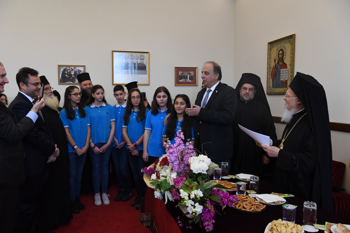 Στη συνέχεια πέντε μαθήτριες και ένας μαθητής του Ζωγραφείου Λυκείου παρουσίασαν ενώπιον του Παναγιωτάτου και των παρισταμένων την ιστορία της Μονής Βλαχερνών και του Ακαθίστου Ύμνου. Οι μαθητές είχαν εκπροσωπήσει τα νιάτα της Ομογένειας, πριν από λίγες ημέρες, με το ίδιο θέμα, στο 5ο Μαθητικό Συνέδριο, που πραγματοποιήθηκε στο Βυζαντινό Μουσείο της Θεσσαλονίκης. Συγκινημένοι, ο Παναγιώτατος και ο Διευθυντής τους Ζωγραφείου Γιάννης Δεμιρτζόγλου συνεχάρησαν τα παιδιά καθώς και τον Καθηγητή τους, Φιλόλογο Διαμαντή Κομβόπουλο, που τα προετοίμασε.