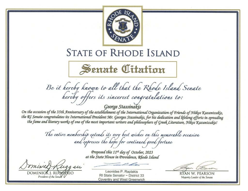 Χάρη στο Μανώλη Βεληβασάκη η Γερουσία του RhodeIslandαπένειμε ειδική διάκριση στο Γιώργο Στασινάκη και στη ΔΕΦΝΚ για την προβολή του έργου του Νίκου Καζαντζάκη στον κόσμο.